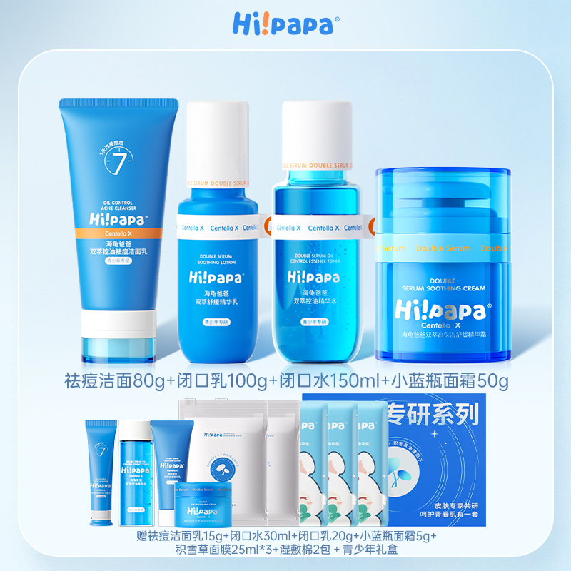 Hi!papa/海龟爸爸 祛痘洁面80g+闭口水150ml+闭口乳100g+小蓝瓶50g+青少年系列礼盒